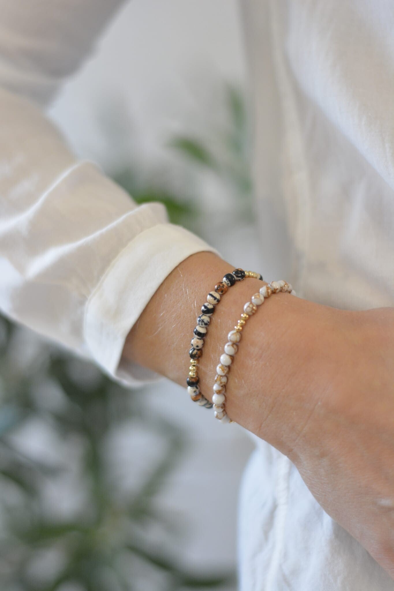 Diese hübschen Armketten werden aus Steinperlen gefertigt. Dazwischen sind noch goldene ionenplattierte Edelstahlperlen eingearbeitet.